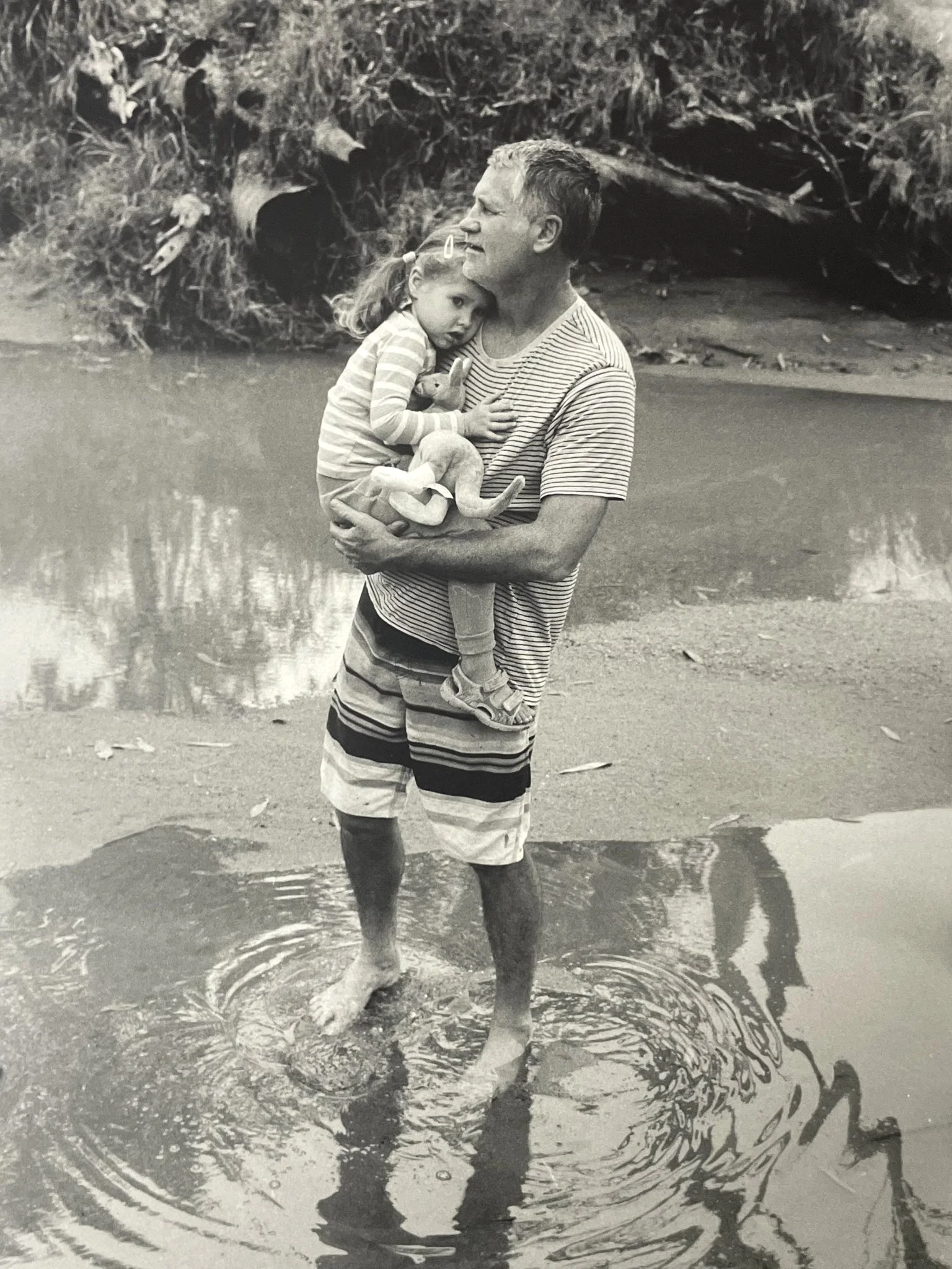 Dad and O' in the Todd River, silver gelatine print, 25 x 18.75 cm, 2022.
